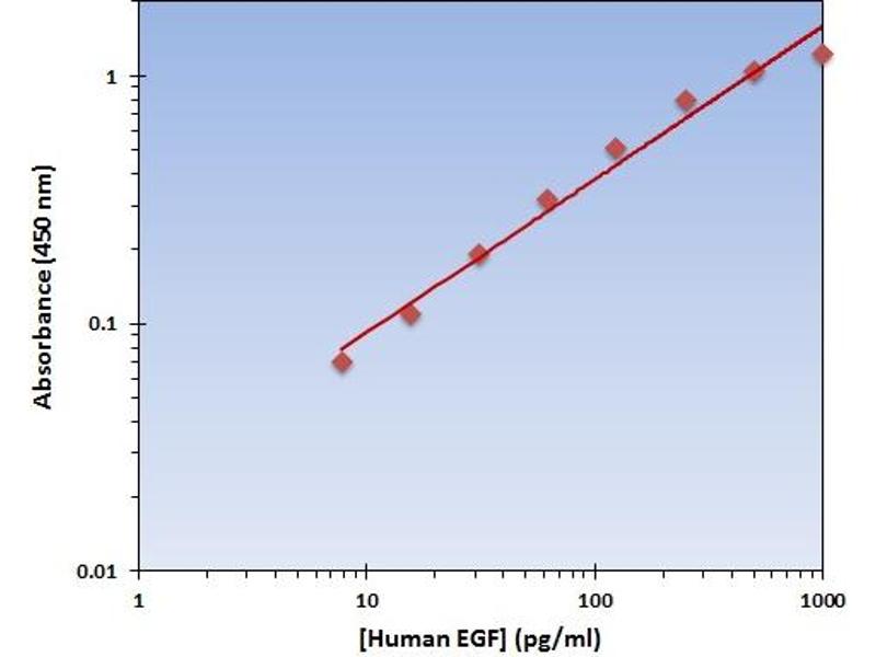 - The OmniKine? Human EGF ELISA Kit contains the components necessary for quantitative determination of natural or recombinant Human EGF concentrations within any experimental sample including cell lysates, serum and plasma. This particular immunoassay utilizes the quantitative technique of a "Sandwich" Enzyme-Linked Immunosorbent Assay (ELISA) where the target protein (antigen) is bound in a "sandwich" format by the primary capture antibodies coated to each well-bottom and the secondary detection antibodies added subsequently by the investigator. The capture antibodies coated to the bottom of each well are specific for a particular epitope on Human EGF while the user-added detection antibodies bind to epitopes on the captured target protein. Amid each step of the procedure, a series of wash steps must be performed to ensure the elimination of non- specific binding between proteins to other proteins or to the solid phase. After incubation and "sandwiching" of the target antigen, a peroxidase enzyme is conjugated to the constant heavy chain of the secondary antibody (either covalently or via Avidin/Streptavidin-Biotin interactions), allowing for a colorimetric reaction to ensue upon substrate addition. When the substrate TMB (3, 3', 5, 5'-Tetramethylbenzidine) is added, the reaction catalyzed by peroxidase yields a blue color that is representative of the antigen concentration. Upon sufficient color development, the reaction can be terminated through addition of Stop Solution (2 N Sulfuric Acid) where the color of the solution will turn yellow. The absorbance of each well can then be read by a spectrophotometer, allowing for generation of a standard curve and subsequent determination of protein concentration.