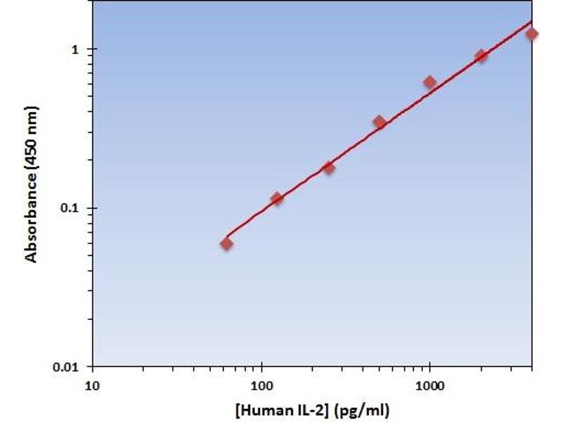 - The OmniKine? Human IL-2 ELISA Kit contains the components necessary for quantitative determination of natural or recombinant Human IL-2 concentrations within any experimental sample including cell lysates, serum and plasma. This particular immunoassay utilizes the quantitative technique of a "Sandwich" Enzyme-Linked Immunosorbent Assay (ELISA) where the target protein (antigen) is bound in a "sandwich" format by the primary capture antibodies coated to each well-bottom and the secondary detection antibodies added subsequently by the investigator. The capture antibodies coated to the bottom of each well are specific for a particular epitope on Human IL-2 while the user-added detection antibodies bind to epitopes on the captured target protein. Amid each step of the procedure, a series of wash steps must be performed to ensure the elimination of non- specific binding between proteins to other proteins or to the solid phase. After incubation and "sandwiching" of the target antigen, a peroxidase enzyme is conjugated to the constant heavy chain of the secondary antibody (either covalently or via Avidin/Streptavidin-Biotin interactions), allowing for a colorimetric reaction to ensue upon substrate addition. When the substrate TMB (3, 3', 5, 5'-Tetramethylbenzidine) is added, the reaction catalyzed by peroxidase yields a blue color that is representative of the antigen concentration. Upon sufficient color development, the reaction can be terminated through addition of Stop Solution (2 N Sulfuric Acid) where the color of the solution will turn yellow. The absorbance of each well can then be read by a spectrophotometer, allowing for generation of a standard curve and subsequent determination of protein concentration.