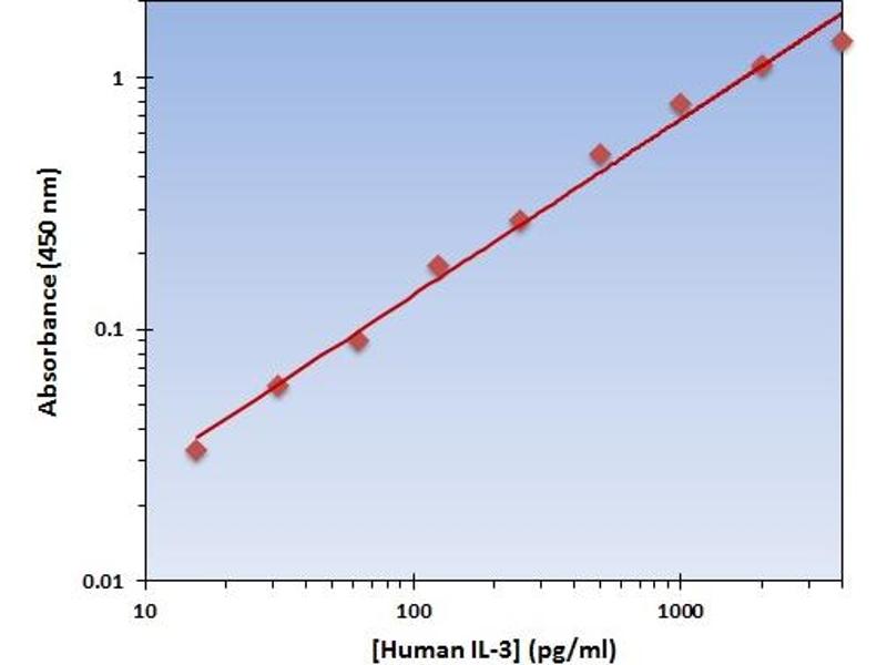 - The OmniKine? Human IL-3 ELISA Kit contains the components necessary for quantitative determination of natural or recombinant Human IL-3 concentrations within any experimental sample including cell lysates, serum and plasma. This particular immunoassay utilizes the quantitative technique of a "Sandwich" Enzyme-Linked Immunosorbent Assay (ELISA) where the target protein (antigen) is bound in a "sandwich" format by the primary capture antibodies coated to each well-bottom and the secondary detection antibodies added subsequently by the investigator. The capture antibodies coated to the bottom of each well are specific for a particular epitope on Human IL-3 while the user-added detection antibodies bind to epitopes on the captured target protein. Amid each step of the procedure, a series of wash steps must be performed to ensure the elimination of non- specific binding between proteins to other proteins or to the solid phase. After incubation and "sandwiching" of the target antigen, a peroxidase enzyme is conjugated to the constant heavy chain of the secondary antibody (either covalently or via Avidin/Streptavidin-Biotin interactions), allowing for a colorimetric reaction to ensue upon substrate addition. When the substrate TMB (3, 3', 5, 5'-Tetramethylbenzidine) is added, the reaction catalyzed by peroxidase yields a blue color that is representative of the antigen concentration. Upon sufficient color development, the reaction can be terminated through addition of Stop Solution (2 N Sulfuric Acid) where the color of the solution will turn yellow. The absorbance of each well can then be read by a spectrophotometer, allowing for generation of a standard curve and subsequent determination of protein concentration.