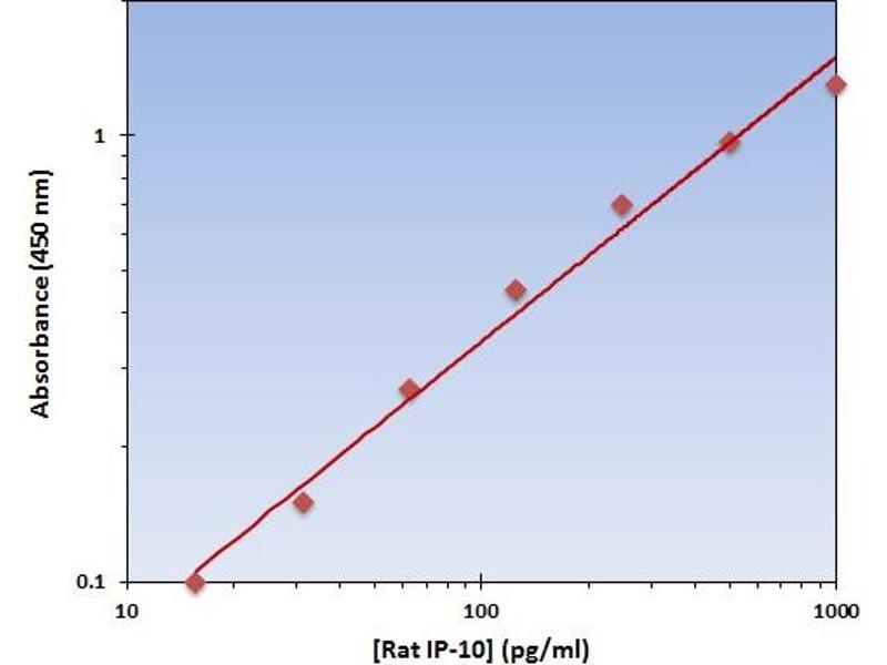 - The OmniKine? Rat IP-10 ELISA Kit contains the components necessary for quantitative determination of natural or recombinant Rat IP- 10 concentrations within any experimental sample including cell lysates, serum and plasma. This particular immunoassay utilizes the quantitative technique of a "Sandwich" Enzyme-Linked Immunosorbent Assay (ELISA) where the target protein (antigen) is bound in a "sandwich" format by the primary capture antibodies coated to each well-bottom and the secondary detection antibodies added subsequently by the investigator. The capture antibodies coated to the bottom of each well are specific for a particular epitope on Rat IP-10 while the user-added detection antibodies bind to epitopes on the captured target protein. Amid each step of the procedure, a series of wash steps must be performed to ensure the elimination of non- specific binding between proteins to other proteins or to the solid phase. After incubation and "sandwiching" of the target antigen, a peroxidase enzyme is conjugated to the constant heavy chain of the secondary antibody (either covalently or via Avidin/Streptavidin-Biotin interactions), allowing for a colorimetric reaction to ensue upon substrate addition. When the substrate TMB (3, 3', 5, 5'-Tetramethylbenzidine) is added, the reaction catalyzed by peroxidase yields a blue color that is representative of the antigen concentration. Upon sufficient color development, the reaction can be terminated through addition of Stop Solution (2 N Sulfuric Acid) where the color of the solution will turn yellow. The absorbance of each well can then be read by a spectrophotometer, allowing for generation of a standard curve and subsequent determination of protein concentration.