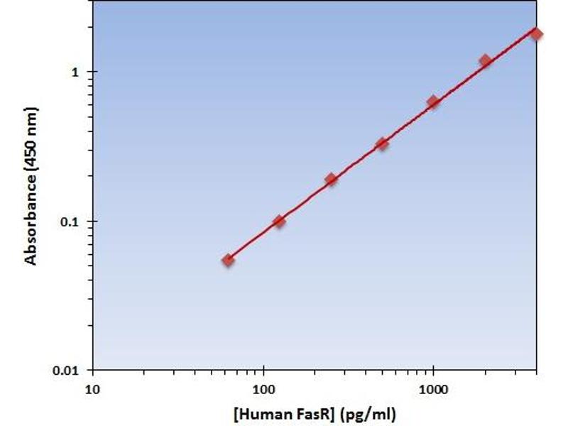 - This particular immunoassay utilizes the quantitative technique of a Sandwich Enzyme-Linked Immunosorbent Assay (ELISA) where the target protein (antigen) is bound in a sandwich format by the primary capture antibodies coated to each well-bottom and the secondary detection antibodies added subsequently by the investigator. The capture antibodies coated to the bottom of each well are specific for a particular epitope on the Human FasR while the user-added detection antibodies bind to epitopes on the captured target protein. Amid each step of the procedure, a series of wash steps must be performed to ensure the elimination of non-specific binding between proteins to other proteins or to the solid phase. After incubation and sandwiching of the target antigen, a peroxidase enzyme is conjugated to the constant heavy chain of the secondary antibody (either covalently or via Avidin/Streptavidin-Biotin interactions), allowing for a colorimetric reaction to ensue upon substrate addition. When the substrate TMB (3, 3’, 5, 5’-Tetramethylbenzidine) is added, the reaction catalyzed by peroxidase yields a blue color that is representative of the antigen concentration. Upon sufficient color development, the reaction can be terminated through addition of Stop Solution (2 N Sulfuric Acid) where the color of the solution will turn yellow. The absorbance of each well can then be read by a spectrophotometer, allowing for generation of a standard curve and subsequent determination of protein concentration.