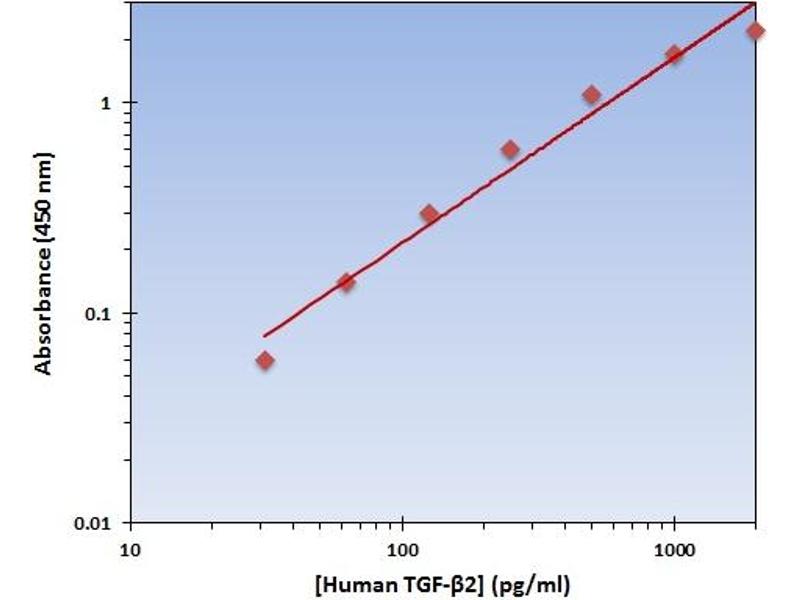 - This particular immunoassay utilizes the quantitative technique of a Sandwich Enzyme-Linked Immunosorbent Assay (ELISA) where the target protein (antigen) is bound in a sandwich format by the primary capture antibodies coated to each well-bottom and the secondary detection antibodies added subsequently by the investigator. The capture antibodies coated to the bottom of each well are specific for a particular epitope on the Human TGF-beta2 cytokine while the user-added detection antibodies bind to epitopes on the captured target protein. Amid each step of the procedure, a series of wash steps must be performed to ensure the elimination of non-specific binding between proteins to other proteins or to the solid phase. After incubation and sandwiching of the target antigen, a peroxidase enzyme is conjugated to the constant heavy chain of the secondary antibody (either covalently or via Avidin/Streptavidin-Biotin interactions), allowing for a colorimetric reaction to ensue upon substrate addition. When the substrate TMB (3, 3’, 5, 5’- Tetramethylbenzidine) is added, the reaction catalyzed by peroxidase yields a blue color that is representative of the antigen concentration. Upon sufficient color development, the reaction can be terminated through addition of Stop Solution (2 N Sulfuric Acid) where the color of the solution will turn yellow. The absorbance of each well can then be read by a spectrophotometer, allowing for generation of a standard curve and subsequent determination of protein concentration.