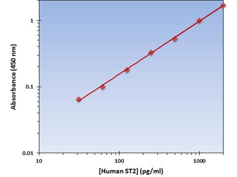 - The OmniKine? Human ST2 ELISA Kit contains the components necessary for quantitative determination of natural or recombinant Human ST2 concentrations within any experimental sample including cell lysates, serum and plasma. This particular immunoassay utilizes the quantitative technique of a "Sandwich" Enzyme-Linked Immunosorbent Assay (ELISA) where the target protein (antigen) is bound in a "sandwich" format by the primary capture antibodies coated to each well-bottom and the secondary detection antibodies added subsequently by the investigator. The capture antibodies coated to the bottom of each well are specific for a particular epitope on Human ST2 while the user-added detection antibodies bind to epitopes on the captured target protein. Amid each step of the procedure, a series of wash steps must be performed to ensure the elimination of non- specific binding between proteins to other proteins or to the solid phase. After incubation and "sandwiching" of the target antigen, a peroxidase enzyme is conjugated to the constant heavy chain of the secondary antibody (either covalently or via Avidin/Streptavidin-Biotin interactions), allowing for a colorimetric reaction to ensue upon substrate addition. When the substrate TMB (3, 3', 5, 5'-Tetramethylbenzidine) is added, the reaction catalyzed by peroxidase yields a blue color that is representative of the antigen concentration. Upon sufficient color development, the reaction can be terminated through addition of Stop Solution (2 N Sulfuric Acid) where the color of the solution will turn yellow. The absorbance of each well can then be read by a spectrophotometer, allowing for generation of a standard curve and subsequent determination of protein concentration.