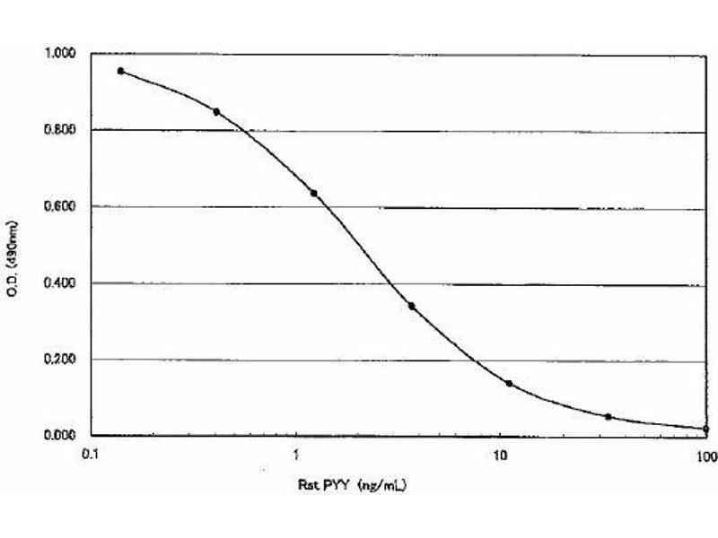 - This enzyme immunoassay (EIA) kit is a stable and convenient assay system for rat Peptide YY (PYY). PYY was isolated initially by Tatemoto et al. (1980) from the extract of pig duodenum and shown to be a polypeptide consisting of 36 amino acid residues. PYY is homologous to pancreatic polypeptide (PP) and neuropeptide Y (NPY). PYY is localized mainly in endocrine cells in the intestine (ileum, colon, and rectum). PYY shows an inhibitory action on contraction of the gastrointestinal tract and on secretion of pancreatic and gastric juice. PYY is released during dieting. The PYY level decreases after resection of the intestine, possibly due to the decrease in number of the endocrine cells secreting PYY. This kit is prepared by using a synthetic rat PYY as the calibrator and biotinylated rat PYY as the labeled antigen. The kit contains a specific polyclonal antibody that recognizes the amino acid sequence of rat PYY. The advantages of this kit include high sensitivity, high specificity, no interference from other plasma components, and no sample pre-treatment. The PYY Calibrator is a highly purified synthetic product (purity: > 98%).This EIA kit is based on a competitive enzyme immunoassay using a highly specific antibody combined with a biotin- avidin affinity system. The 96-well plate is coated with goat anti-rabbit IgG and PYY Calibrators or samples, labeled antigen and anti-rat PYY antibodies are added to the wells for a competitive immuno-reaction. After incubation and washing, HRP-labeled streptoavidins are added to form HRP-labeled streptoavidin-biotinylated rat PYY-antibody complexes on the surface of the wells. Finally, HRP enzyme activity is determined by o-phenylenediamine dihydrochloride (OPD) and the concentration of rat PYY is calculated.