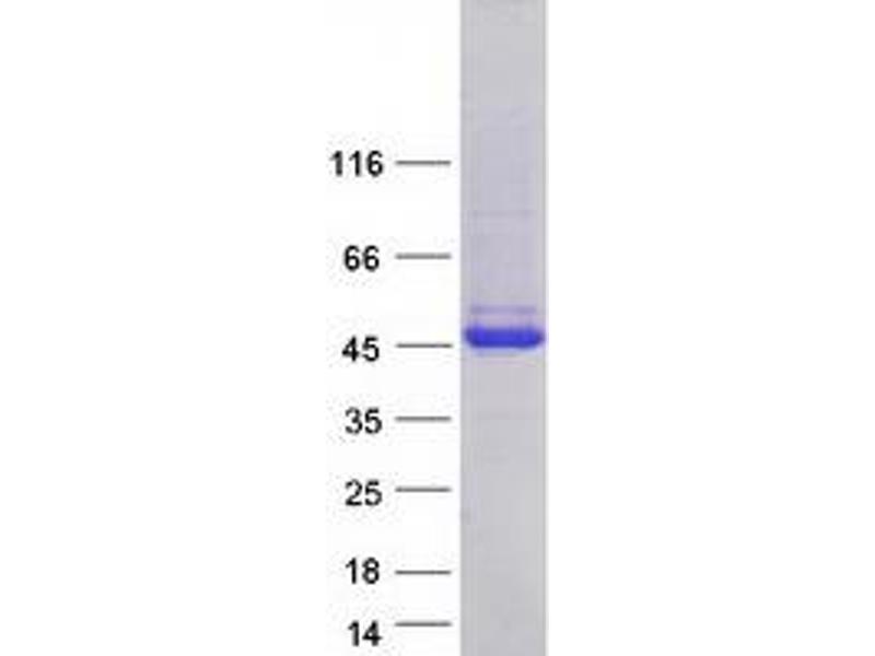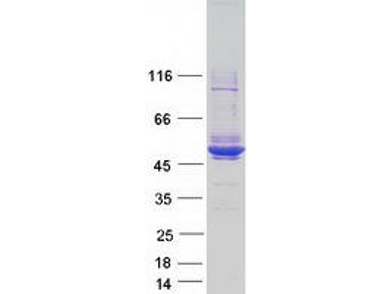 The purity of the protein is greater than 85 % as determined by SDS-PAGE and Coomassie blue staining.