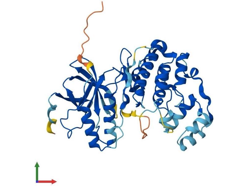Activation of members of the mitogen-activated protein kinase family is a major mechanism for transduction of extracellular signals. Stress-activated protein kinases are one subclass of MAP kinases. The protein encoded by this gene functions as a signal transducer during differentiation of myoblasts to myotubes. [provided by RefSeq, Jul 2008].
