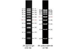 AccuBand™ 100 bp DNA Ladder II provides a sufficient amount of DNA for clear observation of all DNA bands ranging from 100 bp to 1 kb, either in agarose gel or in polyacrylamide gel electrophoresis.