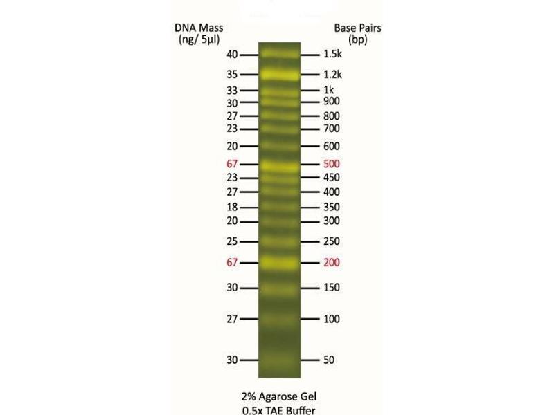 The DNA Ladder is composed of 17 individual DNA fragments: 1.5k, 1.2k, 1k, 900, 800, 700, 600, 500, 450, 400, 350, 300, 250, 200, 150, 100, and 50 bp derived from a mixture of PCR products and specifically digested plasmid DNA, these bands can be visualized when illuminated with 470 nm blue light or a UV light.