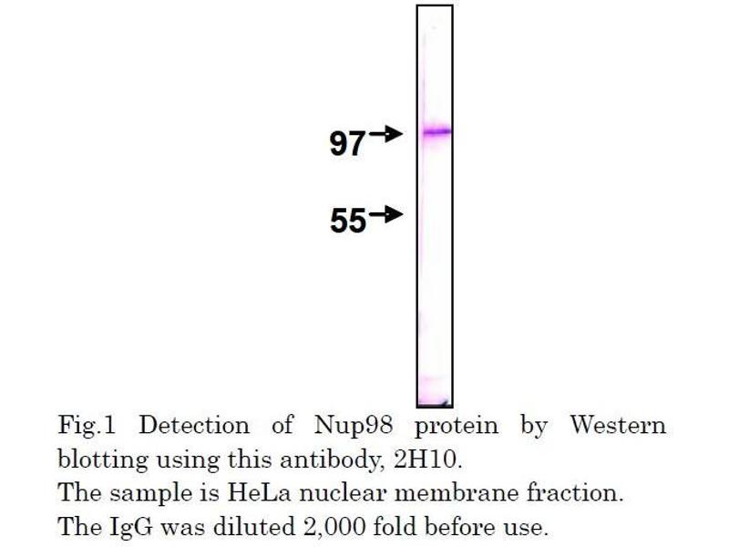 : "Specific monoclonal antibody against the nuclear pore complex protein, nup98." in: Hybridoma (2005), Vol. 24, Issue 5, pp. 244-7, (2005) (PubMed).