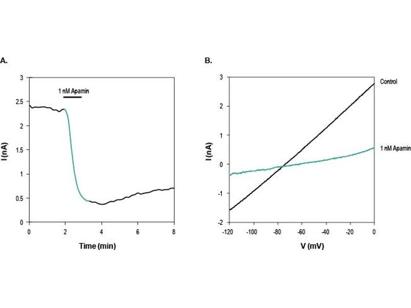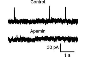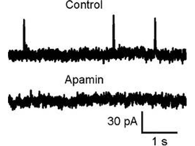 - APM, Apamine,Apamin is a natural peptide isolated and purified from Apis mellifera bee venoM Apamin blocks small conductance Ca2+-activated K+ channels (SK). It is specific for the SK1-3 isoforms, but ineffective in blocking other calcium activated K+ channels2. In mammalian cell lines, Apamin blocks expressed hSK1 with an IC50 of ~10 nM3, rSK1 and rSK2 with IC50 of ~3 and