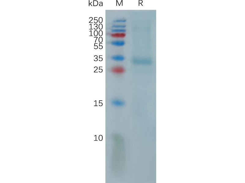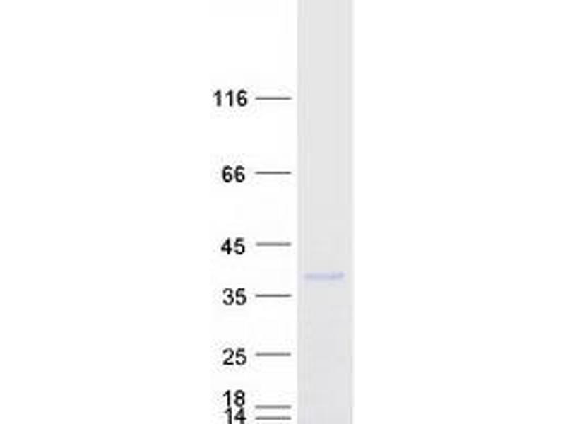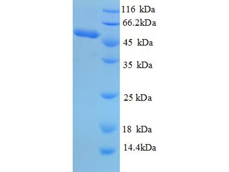 The purity of the protein is greater than 85 % as determined by SDS-PAGE and Coomassie blue staining.