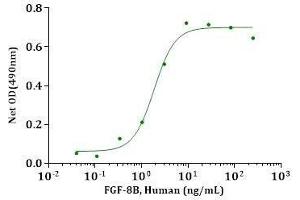 Fibroblast Growth Factor-8 (FGF-8) is a heparin-binding growth factor of the FGF family. There are 4 known forms of FGF8 produced by alternative splicing: FGF8a, FGF-8b, FGF-8e and FGF-8f. The human and mouse FGF8b are identical of aa sequences. FGF-8 plays an important role in the regulation of embryonic development, cell proliferation, cell differentiation and cell migration. FGF-8 is required for normal brain, eye, ear and limb development during embryogenesis. It is also required for normal development of the gonadotropin- releasing hormone (GnRH) neuronal system.Recombinant human Fibroblast Growth Factor-8 (rhFGF-8) produced in E. coli is a single non-glycosylated polypeptide chain containing 194 amino acids. A fully biologically active molecule, rhFGF-8 has a molecular mass of 22.5 kDa analyzed by reducing SDS-PAGE.