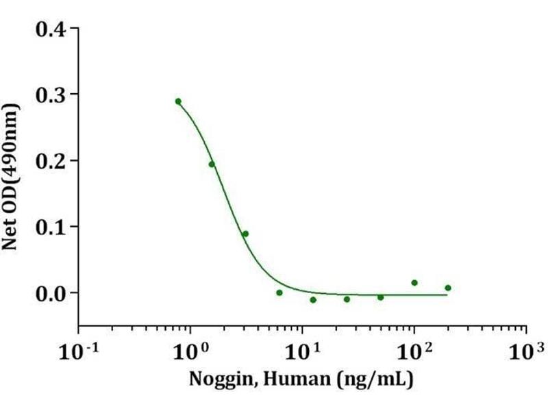 Noggin, also known as NOG, is a homodimeric glycoprotein that bindsto and modulates the activity of TGF-beta family ligands. It is expressed in condensing cartilage and immature chondrocytes. Noggin antagonizes bone morphogenetic protein (BMP) activities by blocking epitopes on BMPs needed for binding to their receptors. Noggin has been shown to be involved in many developmental processes, such as neural tube formation and joint formation. During development, Noggin diffuses through extracellular matrices and forms morphogenic gradients, regulating cellular responses dependent on the local concentration of the signaling molecule.