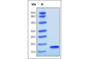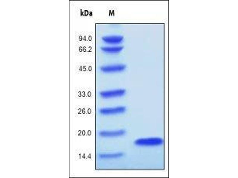 - This protein carries no "tag". The protein has a calculated MW of 15.8 kDa. The protein migrates as 15.8 kDa under reducing (R) condition (SDS-PAGE).