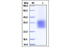 - This protein carries a polyhistidine tag at the C-terminus. The protein has a calculated MW of 14.3 kDa. The protein migrates as 26-42 kDa under reducing (R) condition (SDS-PAGE) due to glycosylation.