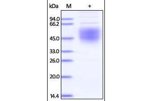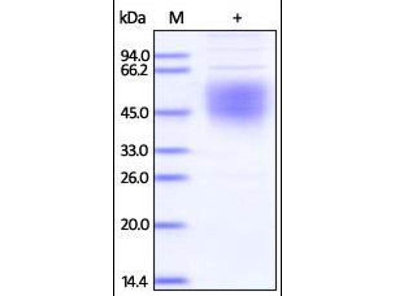 - This protein carries a polyhistidine tag at the C-terminus. The protein has a calculated MW of 31.8 kDa. The protein migrates as 40-60 kDa under reducing (R) condition (SDS-PAGE).