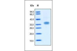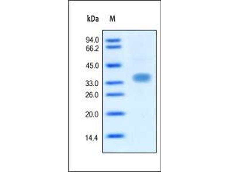 - This protein carries no "tag". The protein has a calculated MW of 25.8 kDa. The protein migrates as 36 kDa under reducing (R) condition (SDS-PAGE) due to glycosylation.