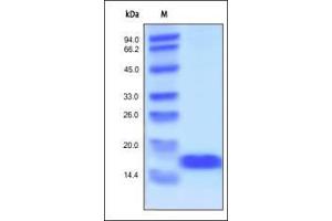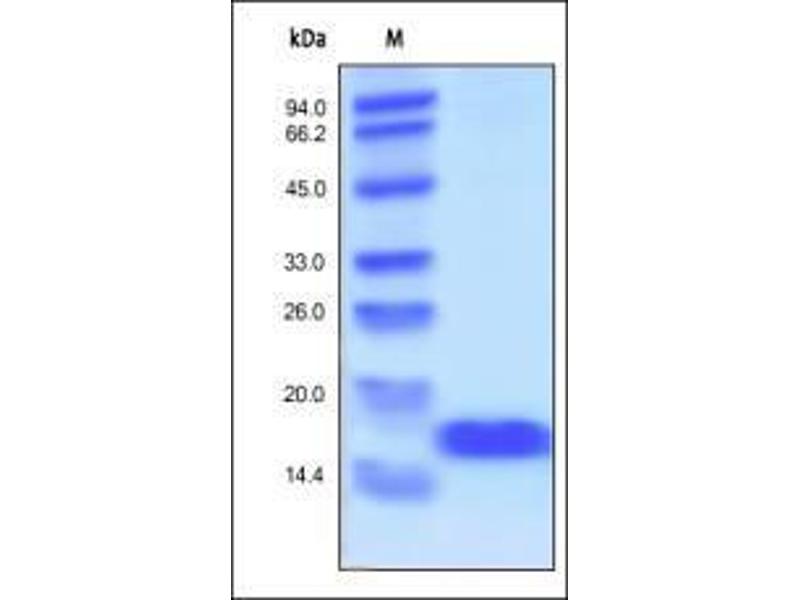- This protein carries no "tag". The protein has a calculated MW of 16.5 kDa. The protein migrates as 17 kDa under reducing (R) condition (SDS-PAGE).