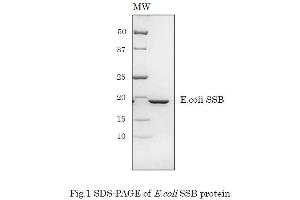 - E.coli single-stranded DNA binding protein (SSB) binds to single-stranded DNA with high specificity. It is involved in DNA replication and recombination in vivo. The SSB gene was expressed as the recombinant protein in E.coli highly purified. The molecular mass is 18.9 kDa.