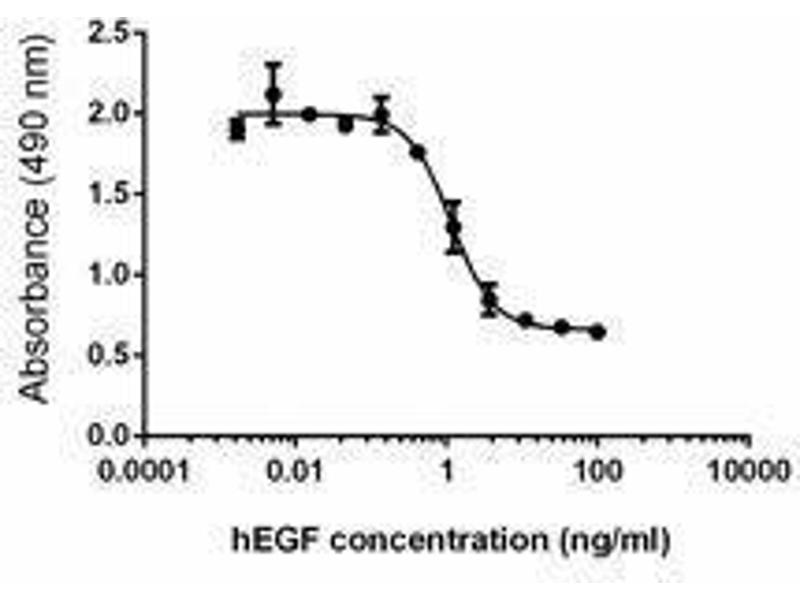 - Epidermal growth factor (EGF) is a small 6 kD polypeptide and has six conserved cysteine residues that form three intramolecular disulfide bonds. Human and mouse EGF share 70 % homology in amino acid structure. Human EGF is synthesized as a transmembrane precursor protein (1207 amino acids) which is proteolytically cleaved to generate the 54 amino acid mature EGF. Many different cells including mammary gland cells, macrophages, gut epithelial cells, and cells in the nervous system and the kidney can produce EGF. EGF plays important roles in the regulation of cell survival, proliferation, and differentiation by binding to its receptor EGFR. For example, EGF can stimulate the proliferation of mouse embryonic stem cells or induce the terminal differentiation/growth inhibition of A431 cells. The binding of EGF to EGFR will induce receptor dimerization, which is required for activating the tyrosine kinase in the receptor cytoplasmic domain. In addition, the binding of EGF to its receptor triggers several signal transduction pathways including JAK/STAT, Ras/ERK and PI3K/AKT pathways. Blocking of the EGF/EGFR pathway can suppress some tumor cell's proliferation. Other members of the EGF family (including transforming growth factor-α (TGF-α), heparin-binding EGF-like growth factor (HB-EGF), amphiregulin (AR), betacellulin (BTC), epiregulin (EPR), and epigen) also bind to EGFR.