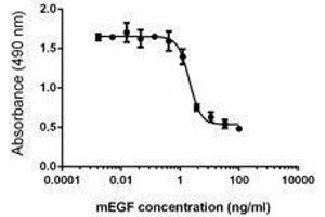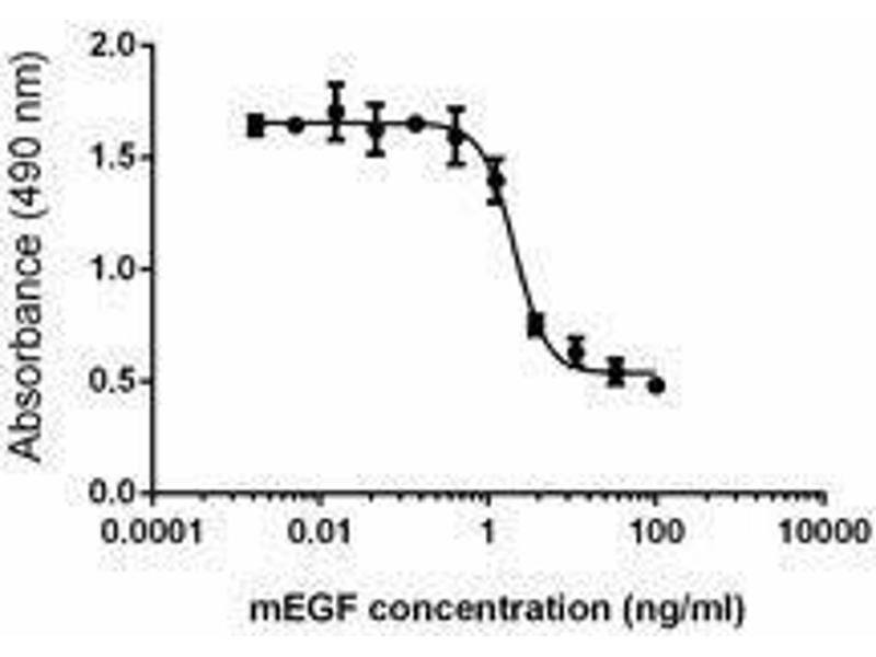 Epidermal growth factor (EGF) is a small 6 kD polypeptide and has six conserved cysteine residues that form three intramolecular disulfide bonds. Human and mouse EGF share 70 % homology in amino acid structure. Mouse EGF is synthesized as a transmembrane precursor protein (1217 amino acids) which is proteolytically cleaved to generate the 53 amino acid mature EGF. Many different cells including mammary gland cells, macrophages, gut epithelial cells, and cells in the nervous system and the kidney can produce EGF. EGF plays important roles in the regulation of cell survival, proliferation, and differentiation by binding to its receptor EGFR. For example, EGF can stimulate the proliferation of mouse embryonic stem cells or induce the terminal differentiation/growth inhibition of A431 cells. The binding of EGF to EGFR will induce receptor dimerization, which is required for activating the tyrosine kinase in the receptor cytoplasmic domain. In addition, the binding of EGF to its receptor triggers several signal transduction pathways including JAK/STAT, Ras/ERK and PI3K/AKT pathways. Blocking of the EGF/EGFR pathway can suppress some tumor cell's proliferation. Other members of the EGF family (including transforming growth factor-α (TGF-α), heparin-binding EGF-like growth factor (HB-EGF), amphiregulin (AR), betacellulin (BTC), epiregulin (EPR), and epigen) also bind to EGFR.