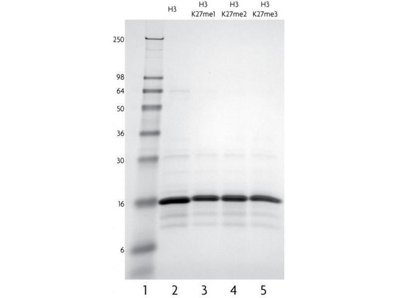 - Recombinant Xenopus laevis Histone H3 monomethyl Lys27 (H3K27me1) is produced in E. coli and purified using FPLC. The protein contains a substitution of cysteine to alanine at amino acid 110. Recombinant methylated histones are specifically methylated via a chemical alkylation reaction that introduces a methyl lysine analog (MLA). This specific chemical treatment enables the site and degree of methylation to be controlled precisely. Each methylation reaction is over 99 % complete, as verified by high-resolution ESI-TOF mass spectrometry. Protein concentration was determined using the molar extinction coefficient for Histone H3 and absorbance at 280nm. The recombinant histone is >98 % pure by SDS-PAGE. The molecular weight of the recombinant histone is 15,271 Daltons.