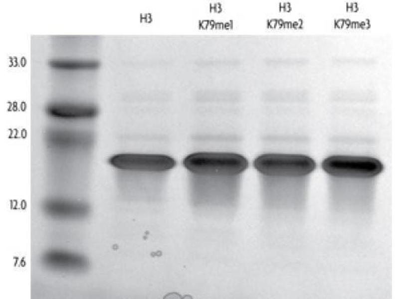 - Recombinant Xenopus laevis Histone H3 monomethyl Lys79 (H3K79me1) is produced in E. coli and purified using FPLC. The protein contains a substitution of cysteine to alanine at amino acid 110. Recombinant methylated histones are specifically methylated via a chemical alkylation reaction that introduces a methyl lysine analog (MLA). This specific chemical treatment enables the site and degree of methylation to be controlled precisely. Each methylation reaction is over 99 % complete, as verified by high-resolution ESI-TOF mass spectrometry. Protein concentration was determined using the molar extinction coefficient for Histone H3 and absorbance at 280nm. The recombinant histone is >98 % pure by SDS-PAGE. The molecular weight of the recombinant histone is 15,271 Daltons.