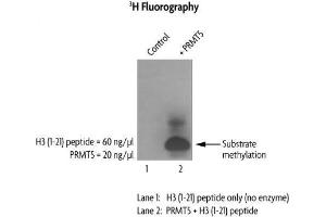 - Recombinant PRMT5 is suitable for use in the study of enzyme kinetics, inhibitor screening, and selectivity profiling. Specific Activity: H3R8 and H4R3 methyltransferase. HMT Assay Conditions:50 mM TrisCl, pH 8.6, 0.02 % Triton X-100, 2 mM MgCl2, 1 mM TCEP, 60 ng/μl H3 (1-21) peptide, 20 ng/μl Recombinant PRMT5 protein at 2 hours at room temperature. Activity was detected by fluorography.