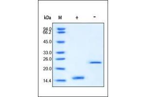 - This protein carries no "tag". The protein has a calculated MW of 13 kDa. The protein migrates as 14 kDa under reducing (R) condition, and 27 kDa under non-reducing (NR) condition (SDS-PAGE).