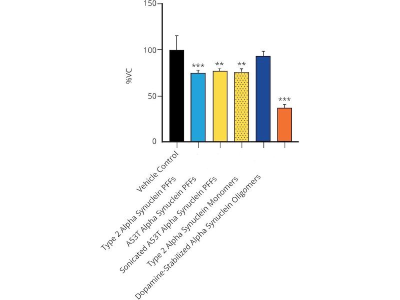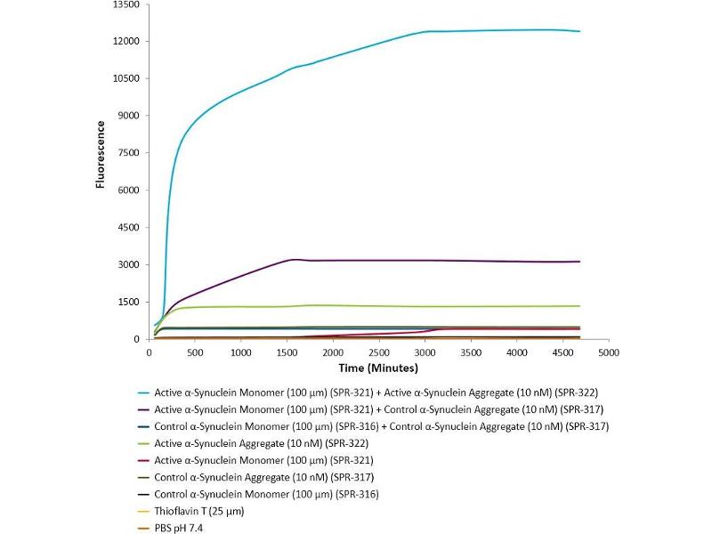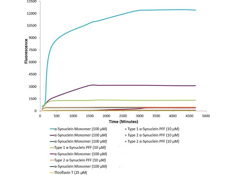 - Does not induce Lewy body inclusion formation in Sprague-Dawley rat primary hippocampal neurons. Thioflavin T emission curve shows only a small increase in fluorescence (indicative of alpha synuclein aggregation) when Type 2 alpha synuclein PFFs (SPR-317) are combined with alpha synuclein monomers (SPR-321 or SPR-316). Certain biological activities in other neuronal cells cannot be ruled out. Researchers should test compatibility prior to use.
