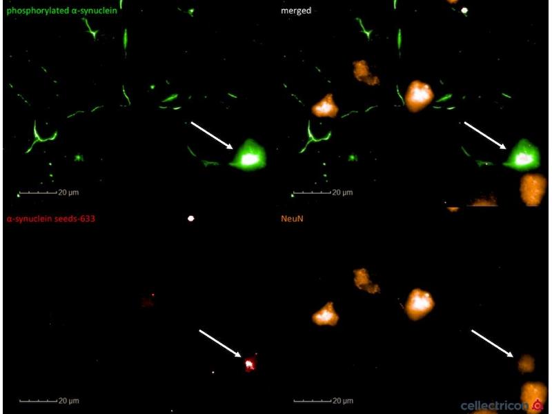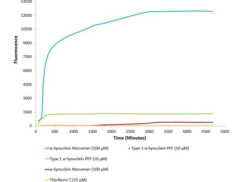 - Endogenous alpha-synuclein phosphorylation. 100 μM alpha synuclein protein monomer (SPR-321) seeded with 10 nM alpha synuclein protein PFF (SPR-322) in 25 μM Thioflavin T (PBS pH 7.4, 100 μl reaction volume) generated a fluorescence intensity of 13,000 Relative Fluorescence Units after incubation at 37°C with shaking at 600 rpm. Fluorescence was measured by excitation at 450 nm and emission at 485 nm on a Molecular Devices Gemini XPS microplate reader.
