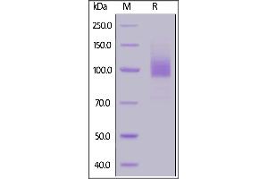 This protein carries a polyhistidine tag at the C-terminus, followed by an Avi tag. The protein has a calculated MW of 72.3 kDa. The protein migrates as 100-125 kDa under reducing (R) condition (SDS-PAGE) due to glycosylation.