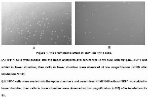 - SDF1 (stromal cell-derived factor 1), also known as C-X-C motif chemokine 12, is a chemokine protein that has chemotaxis active on T-lymphocytes and monocytes. It is thought that SDF1 stimulates migration of monocytes and T-lymphocytes through its receptors, CXCR4 and ACKR3; thus, chemotaxis assay used 24-well microchemotaxis system was undertaken to detect the chemotactic effect of SDF1 on the human monocytic cell line THP-1. Briefly, THP-1 cells were seeded into the upper chambers (100uL cell suspension,106cells/mL in RPMI 1640 with 0.5% FBS) and SDF1 (10ng/mL, 30ng/mL and 60ng/mL diluted separately in serum free RPMI 1640) was added in lower chamber with a polycarbonate filter (8μm pore size) used to separate the two compartments. After incubation at 37°C with 5% CO2 for 3h, the filter was removed, then cells in low chamber were observed by inverted microscope at low magnification (x100) and the number of migrated cells were counted at high magnification (x400) randomly (five fields for each filter). Result shows SDF1 is able to induce migration of THP-1 cells. The migrated THP-1 cells in low chamber at low magnification (x100) were shown in Figure 1. Five fields of each chamber were randomly chosen, and the migrated cells were counted at high magnification (x400). Statistical results were shown in Figure 2. The optimum chemotaxis of SDF1 occurs at 10ng/mL.