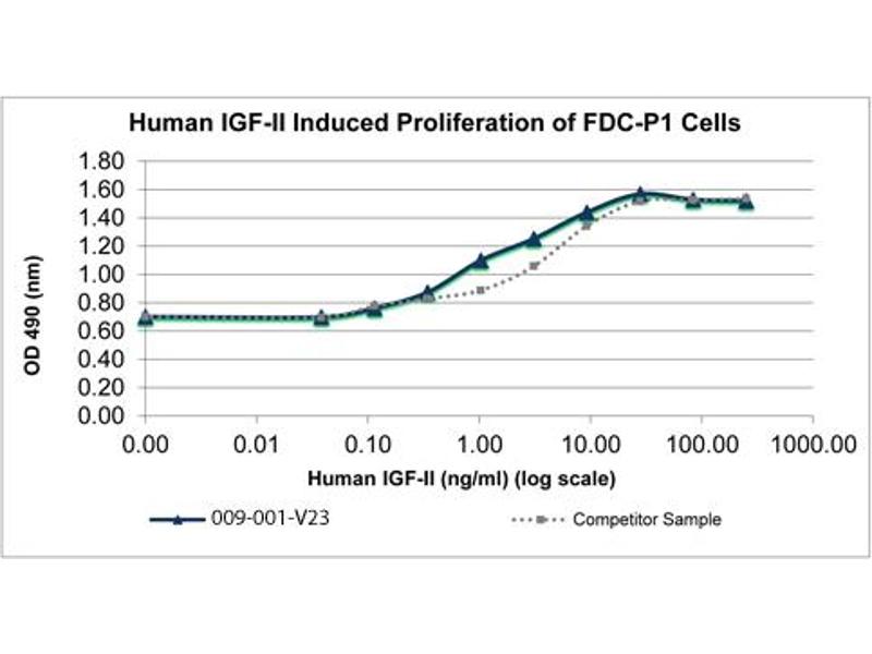 Background: Insulin-like Growth Factor II, IGF-II, is a major growth hormone made by Theca cells during gestation. While IGF-II is known to engage the IGF-I receptor (IGF1R) to mediate embryonic growth, IGF-II is also known to bind the IGF-II receptor (IGF2R). IGF2R is thought to be signaling dead receptor that acts as a sink by binding up free IGF-II. Recombinant human IGF-II is non-glycosylated protein, containing 67 amino acids, with a molecular weight of 7.5 kDa.