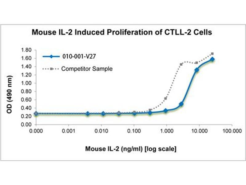 Background: Interleukin-2 (IL-2) is an immuno-modulatory cytokine produced by stimulated T cells. IL-2 signals through the IL-2R receptor to induce proliferation of activated T cells. IL-2 also stimulates proliferation and differentiation of B cells, natural killer cells, monocytes and macrophages. Recombinant mouse IL-2 is a non-glycosylated protein, containing 149 amino acids, with a molecular weight of 17.2 kDa.