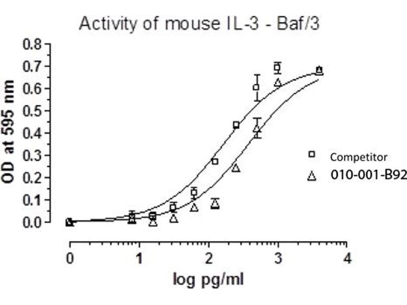 Application Note: Mouse Interleukin-3 Recombinant Protein has been tested by biological activity and is suitable as a control for polyclonal or monoclonal anti-Mouse Interleukin-3 in immunological assays.