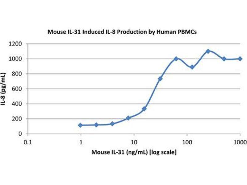 Background: Interleukin-31 (IL-31) is an immunoregulatory cytokine that is mainly expressed by activated TH2 cells. IL-31 signals through the IL-31 Receptor (IL-31RA) and the oncostain receptor (OSMR), which are expressed on monocytes, epithelial cells, and keratinocytes. IL-31 has a role in inflammatory skin diseases. Recombinant mouse IL-31 is a non-glycosylated protein, containing 141 amino acids, with a molecular weight of 15.7 kDa.