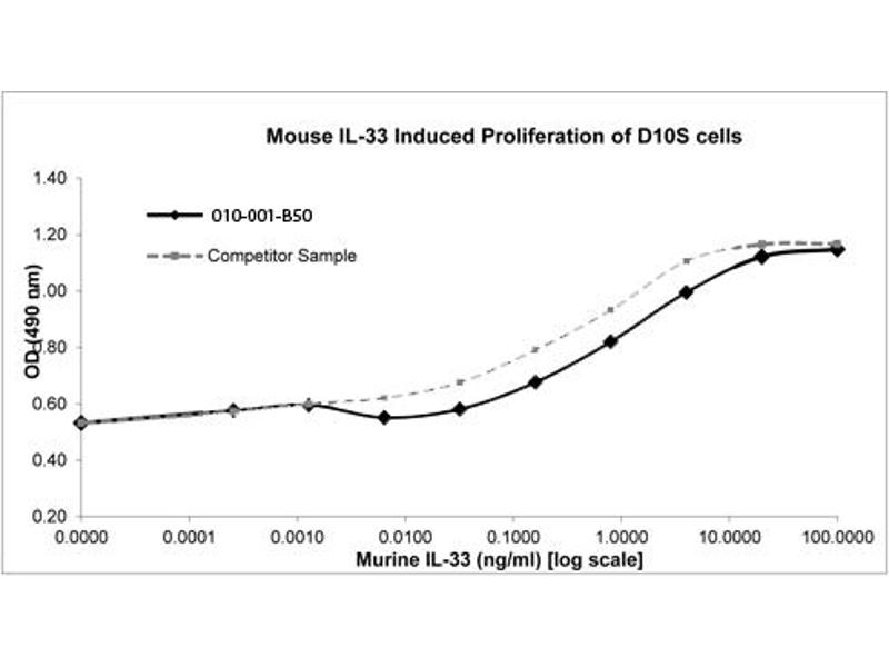 Background: Interleukin 33 (IL-33) is a member of the IL-1 cytokine family and is constitutively expressed in smooth muscle cells and the airway epithelium. IL-33 signals through receptors, IL-1RL1 and IL-1RAP, to induce type 2 cytokine production in polarized Th2 cells. Recombinant mouse IL-33 is a non-glycosylated protein, containing 159 amino acids, with a molecular weight of 17.7 kDa.