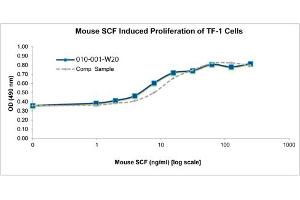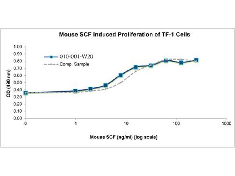 Background: Stem Cell Factor (SCF) is a cytokine made by fibroblasts and endothelial cells. SCF binds to the receptor known as c-Kit (CD117) and is thought to play a critical role in the maintenance or survival of hematopoietic stem cells. Human SCF shows no activity on murine cells, but murine and rat SCF are active on human cells. Recombinant mouse SCF is a non-glycosylated protein, containing 164 amino acids, with a molecular weight of 18.3 kDa.