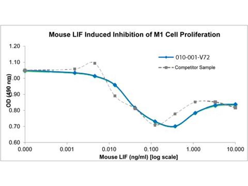 Background: Mouse Leukemia Inhibitory Factor (LIF) is member of the IL-6 family and is made by a variety of tissues. LIF signals through receptors gp190 (LIFR) and gp130 to activate STAT3 which ultimately promotes mouse embryonic stem cell self-renewal and pluripotency of long term cultures. This activity is similar to that attributed to FGF-basic (FGF-2) for human embryonic stem cells. Recombinant mouse LIF is a non-glycosylated protein, containing 181 amino acids, with a molecular weight of 20 kDa.