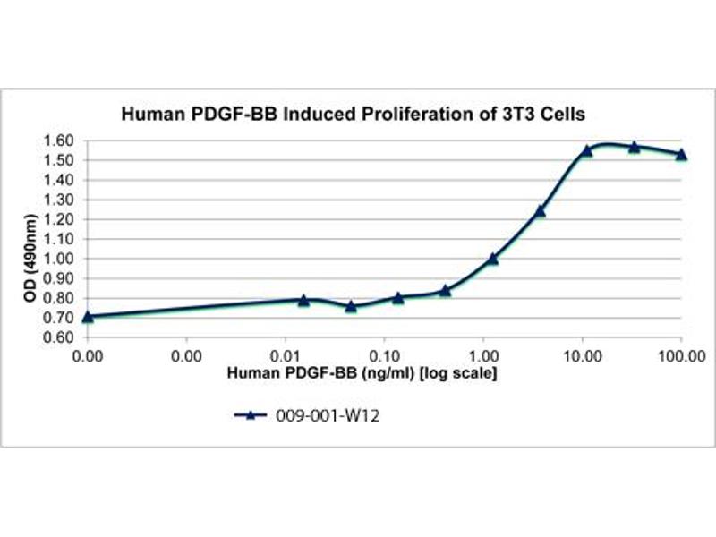 Background: Platelet-Derived Growth Factor (PDGF) is a mitogenic peptide growth hormone carried in the alpha-granules of platelets and is released when platelets adhere to traumatized tissues. Connective tissue cells near the traumatized region respond by initiating the process of replication. The synthesis of PDGF can be induced by IL-1, IL-6, TNF-α, TGF-β and EGF. Recombinant human PDGF-BB is a non-glycosylated, disulfide-linked homodimer, containing two 109 amino acid chains, with a total molecular weight of 24.3 kDa.