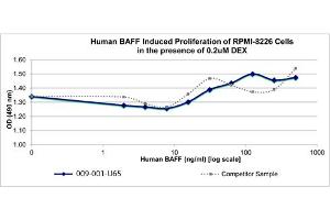 Background: Human B cell Activating Factor (BAFF), is a Type II member of the TNF superfamily. Although it is typically a transmembrane protein expressed on T cells, macrophages and dendritic cells, it can also be cleaved in the extracellular region to produce a soluble form detectable in the serum. BAFF is thought to be important for the survival and maturation of peripheral B cells. BAFF initiates signaling through three receptors with human BAFF having activity on mouse splenocytes. Recombinant human BAFF is a non-glycosylated protein containing a N terminal His tag, a thrombin cut site and 153 amino acids of the TNF-like domain. This protein has a total molecular weight of 18.5 kDa.