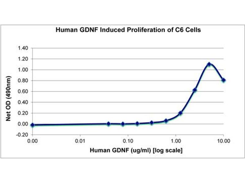 Background: Glial Cell Line-Derived Neurotrophic Factor (GDNF) is a neurotrophic factor that is closely related to other neurotrophic factors, such as Neurturin, Persephin, and Artemin, by a common structural feature called the cysteine-knot. GDNF signals through a multicomponent system of receptors that includes RET and GFRα1-4, to promote dopamine uptake, survival and differentiation of neurons. Recombinant human GDNF is a non-glycosylated homodimer, containing two 135 amino acid chains, with a total molecular weight of 30.4 kDa.