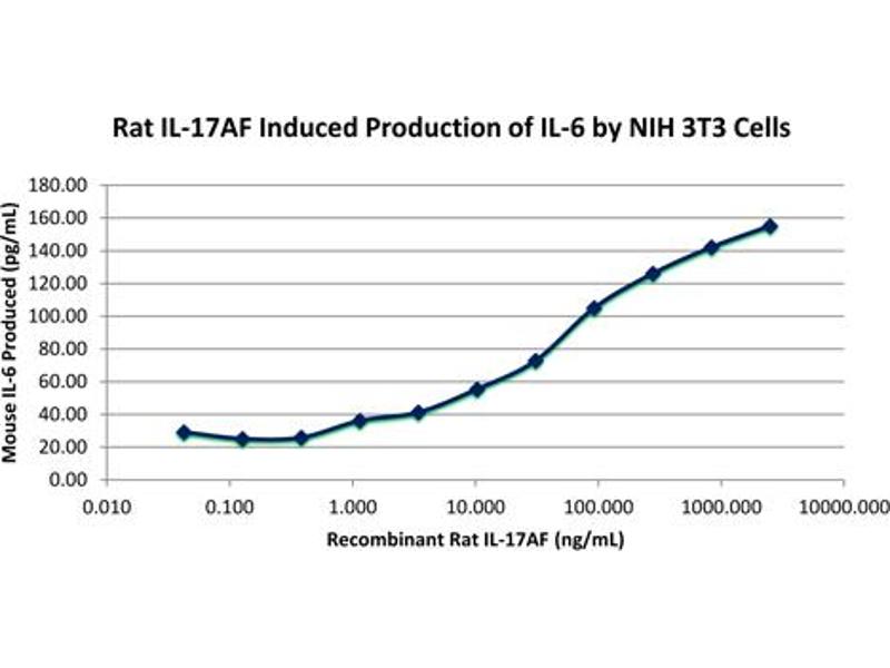 Background: Interleukin-17AF (IL-17AF) is a member of the IL-17 family of proteins produced by a subset of T cells, called Th17, following stimulation with IL-23. Since IL-17AF is thought to signal through the IL-17RA receptor, its biological function is similar to that of IL-17A in that it induces the production of a variety of chemokines, in addition to airway neutrophilia. In regard to these functions, IL-17AF has less activity than the IL-17A homodimer but, greater activity than the IL-17F homodimer. Human and rat IL-17AF both show activity on mouse cells. Recombinant rat IL-17AF is a non-glycosylated, disulfide-linked heterodimer, containing one IL-17A subunit and one IL-17F subunit. The dimer has a total of 269 amino acids, with total molecular weight of 30.7 kDa.