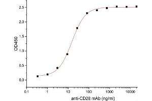 - Immobilized Human/Cynomolgus CD28-His(Cat#C406) at 2μg/ml (100 μl/well) can bind Anti-CD28 mAb(Cat#A063). The ED50 of Anti-CD28 mAb(Cat#A063) is 15.3 ng/ml.