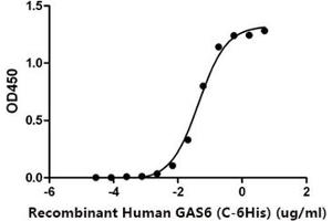 - Immobilized Human AXL-His (Cat#C02B) at 10μg/ml (100 μl/well) can bind Human GAS6-His* (Cat#C01W).*: Biotinylated by NHS-biotin prior to testing.The ED50 of Recombinant Human GAS6-His* (Cat#C01W) is 0.04466 ug/ml.