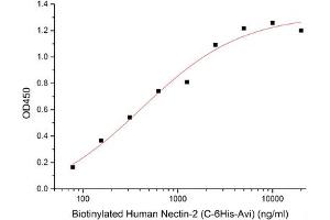 - 1.Immobilized Human PVRIG-mFc(Cat#C08Y) at 10μg/ml (100 μl/well) can bind Human Nectin-2-His(Cat#C440).The ED50 of Human Nectin-2-His(Cat#C440) is 3.72 ug/ml. 2.Immobilized Human PVRIG-mFc(Cat#C08Y) at 10μg/ml (100 μl/well) can bind Biotinylated Human Nectin-2-His-Avi(Cat#CY73). The ED50 of Biotinylated Human Nectin-2-His-Avi(Cat#CY73) is 0.42 ug/ml.