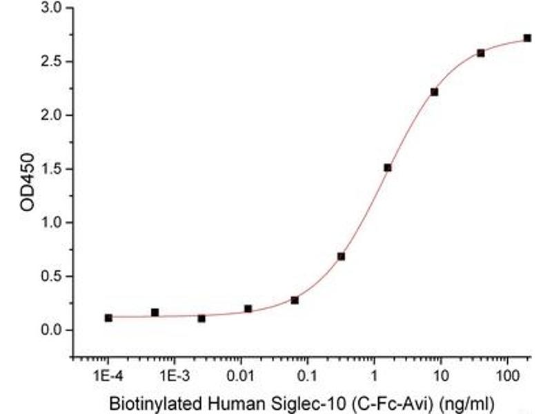 - Immobilized Anti-Human Siglec10 mAb(Cat#NC035) at 1μg/ml (100 μl/well) can bind Biotinylated Human Siglec-10-Fc-Avi(Cat#CY47 ). The ED50 of Biotinylated Human Siglec-10-Fc-Avi(Cat#CY47 ) is 1.45 ng/ml.