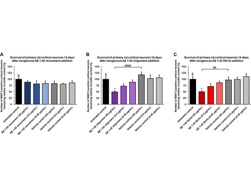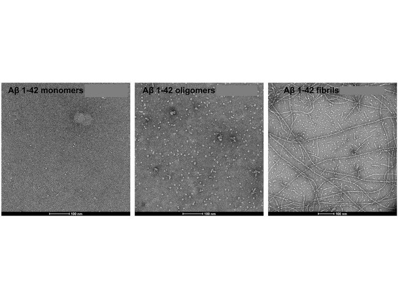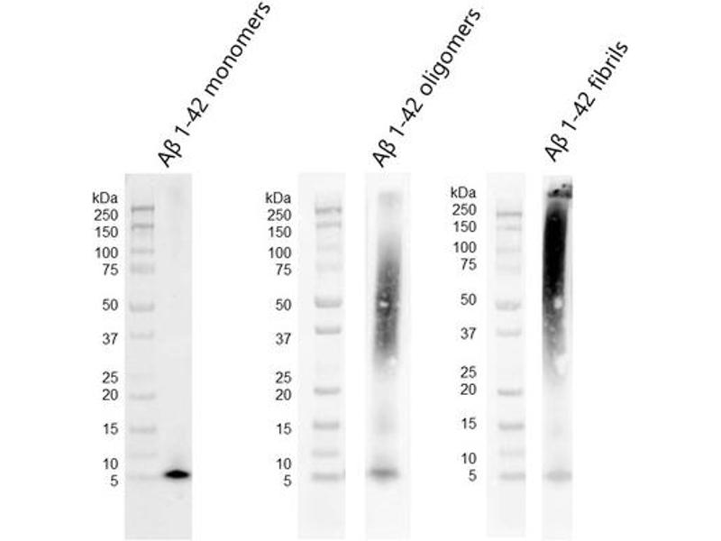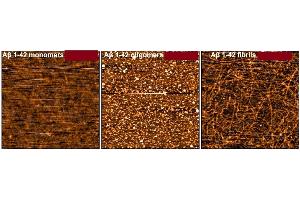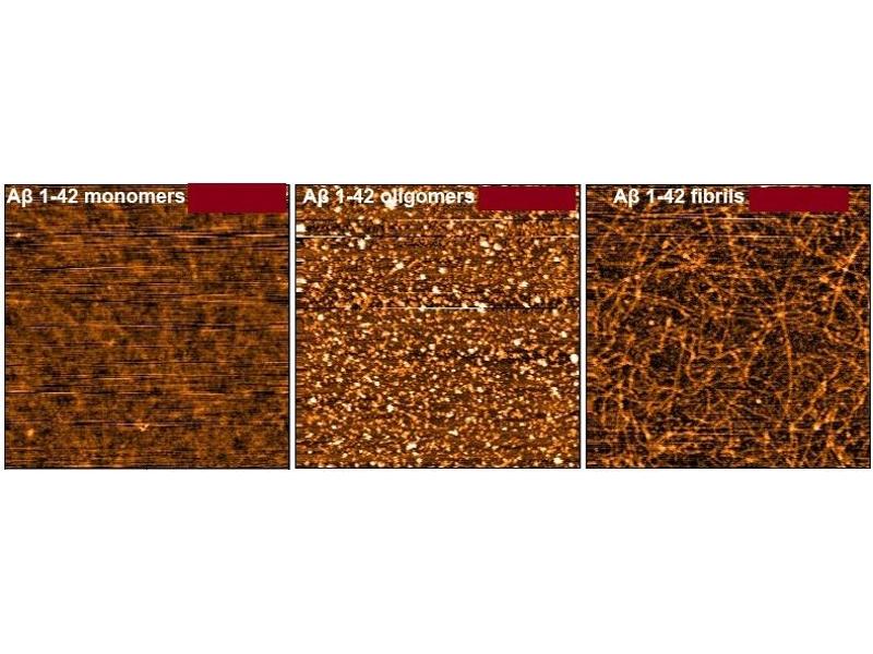 - Our amyloid beta peptide 1-42 (Aβ42) is produced synthetically and treated with 1,1,1,3,3,3-Hexafluoro-2-propanol (HFIP) prior to drying which breaks down pre-formed fibrils and monomerizes the peptide, as previously published (1,2). Upon resuspension in DMSO/dH2O, our Aβ42 presents as a monomeric peptide without fibrils when observed under TEM, AFM and on a Western Blot with an anti-amyloid beta antibody. In contrast to AB42 oligomer and fibril constructs, our Aβ42 monomers were not toxic to primary rat cortical neurons. In the brain, amyloid beta peptide (Aβ) is generated by protease cleavage of amyloid precursor protein (APP), which aggregates into oligomers, protofibrils, fibrils and ultimately plaques in neurodegenerative diseases. The accumulation of Aβ plaques in the brain is considered a hallmark of Alzheimer's disease (AD), and most of the drugs tested for AD in the past 20 years have targeted amyloid beta accumulation (3). Soluble Aβ oligomers isolated from the brains of AD patients or those generated in vitro potently impaired synapse structure and function (4). Aβ oligomers generated in vitro were toxic to PC12 cells (2) and SH-SY5Y cells (5). Aβ was demonstrated to interact with tauopathies to affect neurodegeneration in AD patients (6) and accumulations of Aβ were shown to be associated with lower survival rates in Parkinson's disease patients with dementia (7)., cellular localisation: Cell Membrane , Intracellular Vesicles