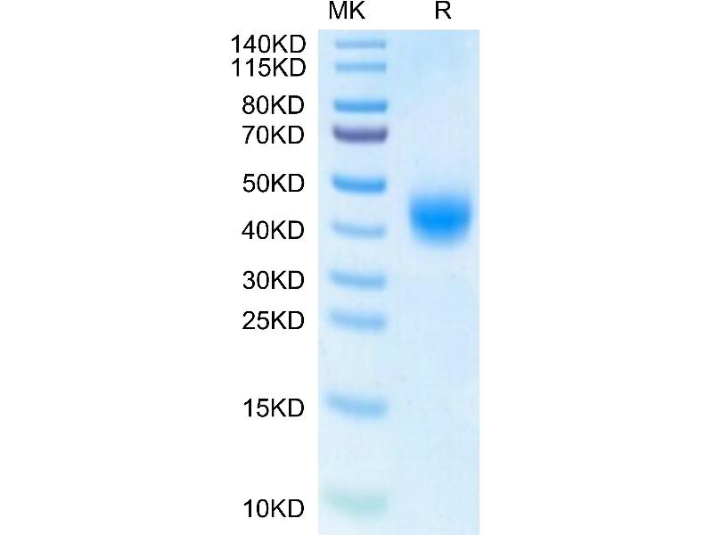 - 25.65 kDa. Due to glycosylation, the protein migrates to 38-48 kDa based on Tris-Bis PAGE result.